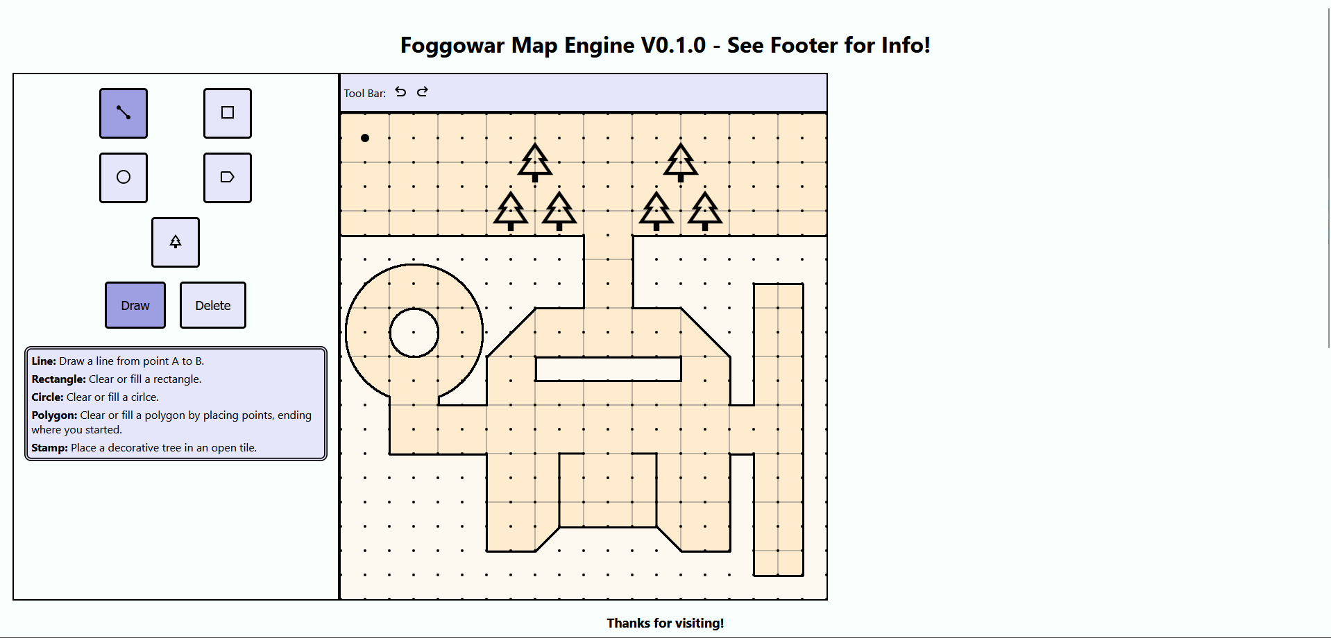 This is a snippet of a project that I have been wanting to make for a very long time, a project that ChaoticEvents was a practice run for. I really enjoy table top RPG's, they are one of my favorite social activities, and I find that a lot of solutions for running a tabletop virtually just don't line up with my personal tastes. I don't want to speak specutively, so for now if you look at a product like Roll20, you will get a rough idea of what I'm building towards, howevever this project will become its own unique offering. I decided to develop Foggowar to fill the design niches that I want to see in software like this. In its current form, Foggowar is just a demo of the map designer front end that is going to be a small part of a much larger, multiuser project. It might not look like too much now, however if you take a look at my source code you will see an unexpectedly robust foundation that a seemingly simple UI is built on. Right now, the skills I want to showcase through Foggowar are simple UI design, taking user input and turning into output, and my process for building a piece of something greater with scalability in mind.