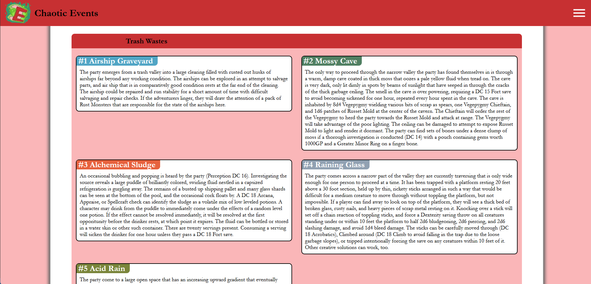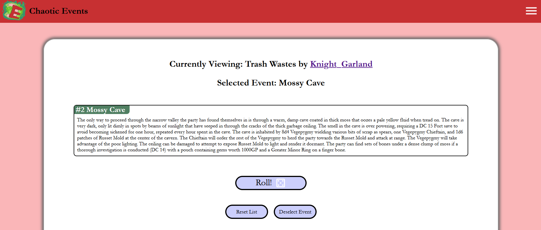 My first coding project since becoming employed as a Healthcare Simulation Technician was Chaotic Events. It is a web app designed for TTRPG players of any system (Dungeons & Dragons, Pathfinder, GERPS, etc.) to create and share interactable random event tables for their games. It is a MERN stack application employing MongoDB, Express, React, and Node.js to deliver a fun interface and social experience to users. Its biggest feature is allowing users to share, rate, save, and use event tables without the need of dice. I wanted to make it as an example of a CRUD (Create, Read, Update, Delete) application and as a way to get back in to coding and learn a new tech stack. It has lots of fun features beyond simple CRUD functions, and I hope it can serve as a place for people to be expressive and find help for a hobby that I really love. I had a lot of fun designing it, trying to strictly use HTML and CSS with no outsise UI and make it remeniscent of the early days of the internet filled with more colors than just blue, gray, and white. It is truely a passion project for me, and links to its home page and source code can be found below.